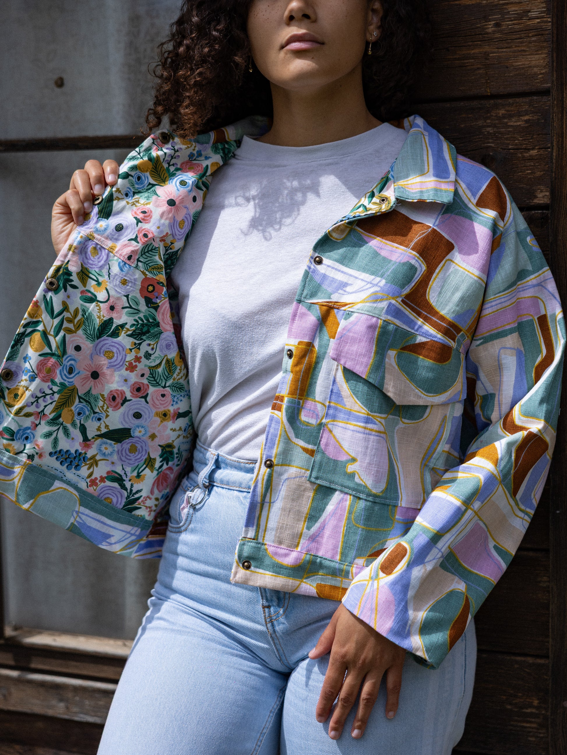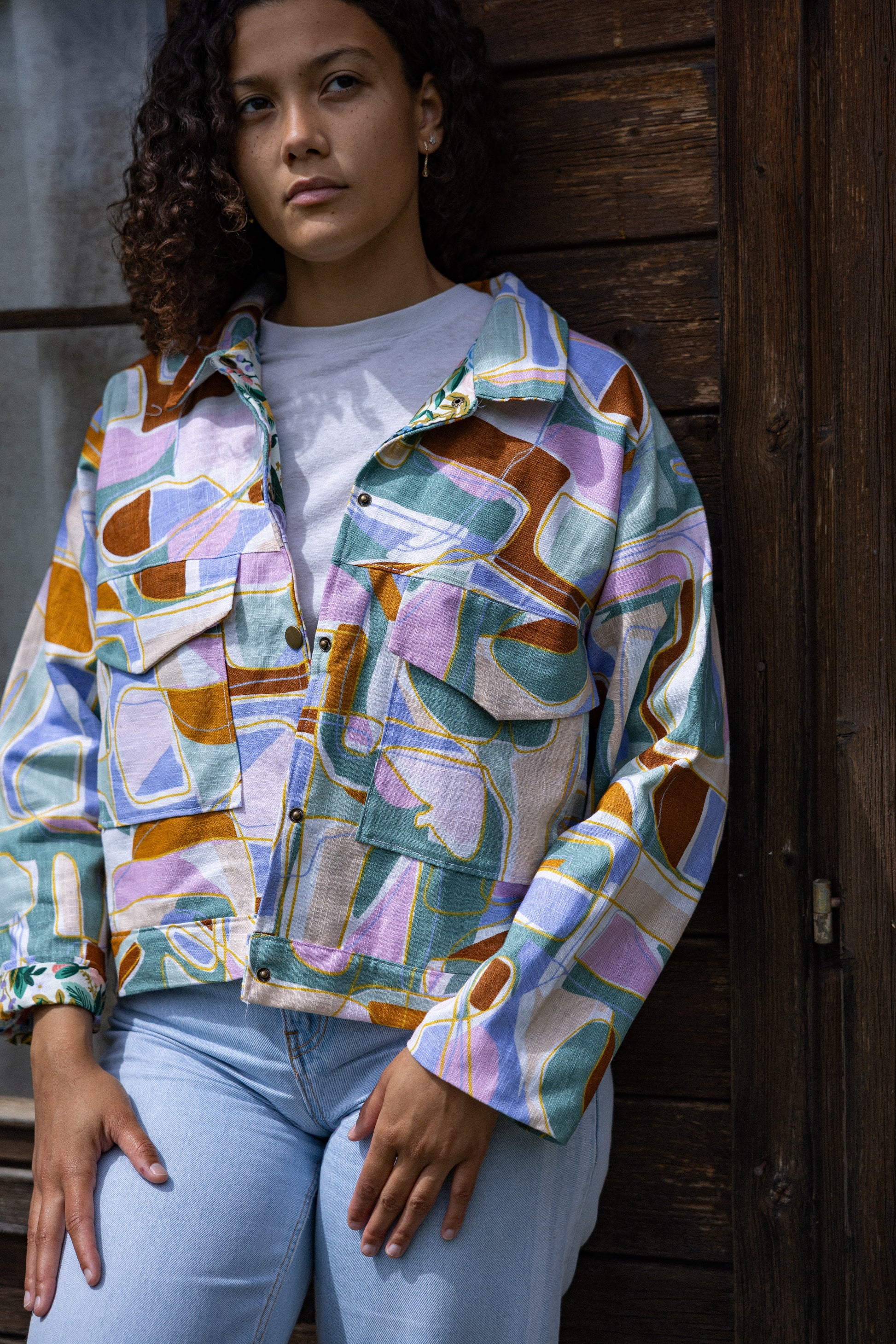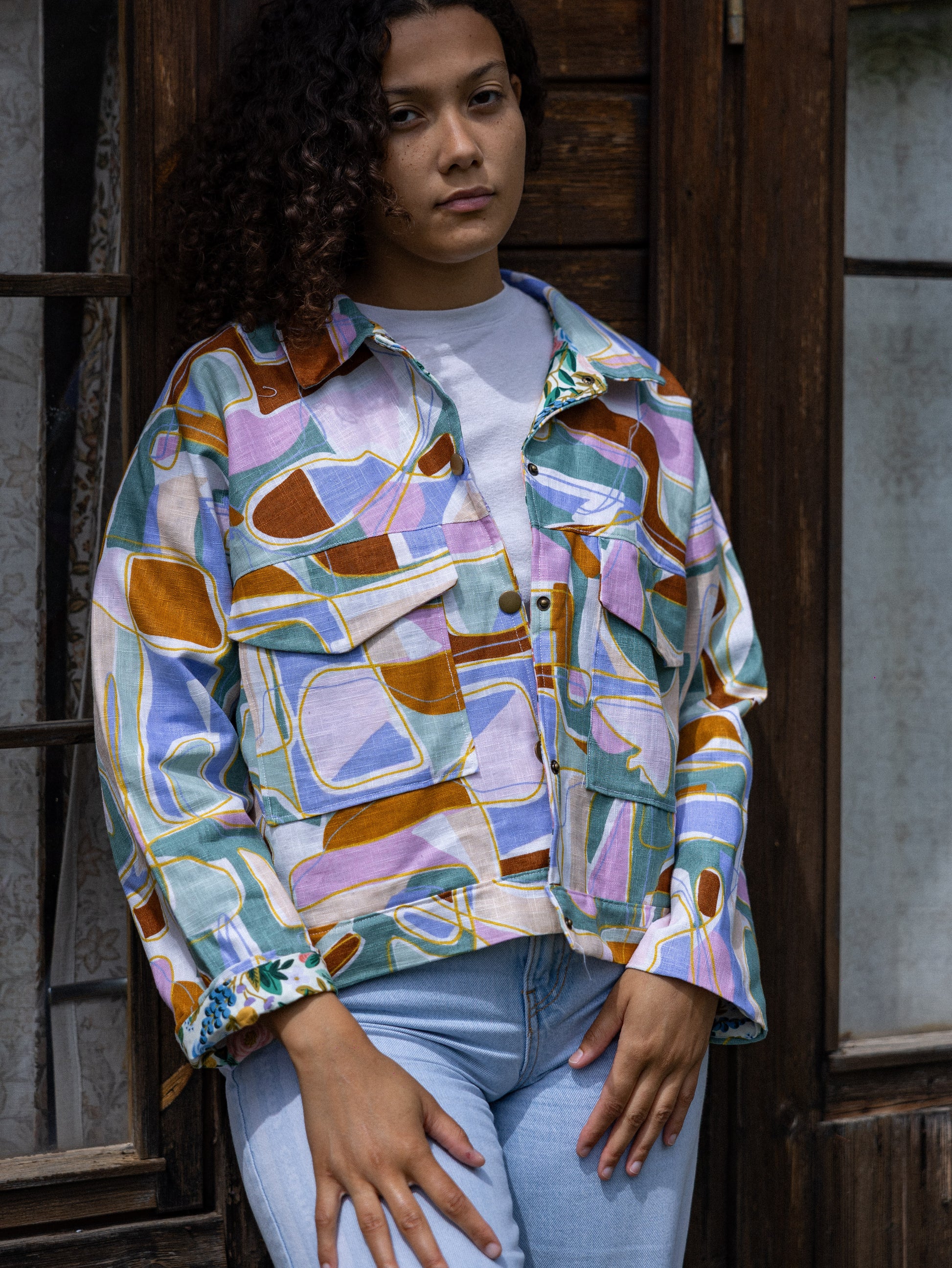 Cette veste droite en lin est une invitation permanente à la douceur de vivre, avec son imprimé géométrique multicolore qui joue avec la lumière et sa doublure fleurie GARDEN PARTY.